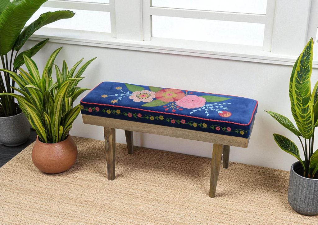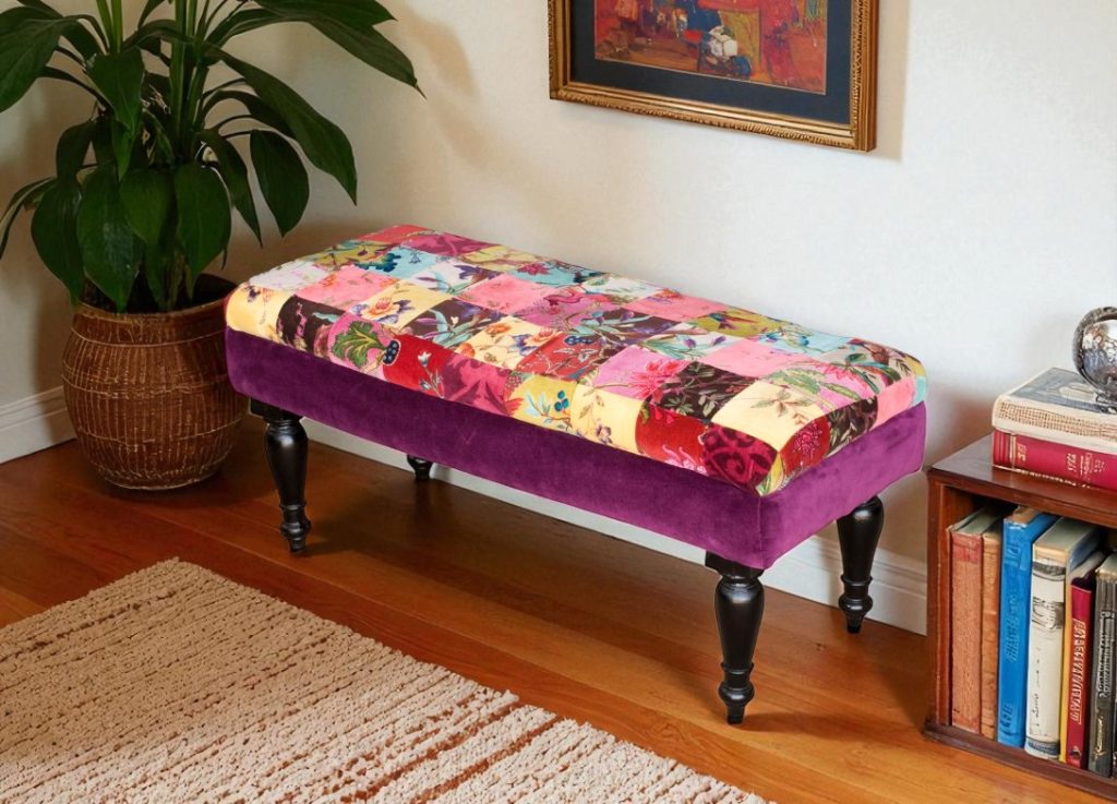 • The Patchwork Bench: This unique bench features a captivating patchwork design, showcasing a colorful blend of fabrics and patterns. The plush velvet cushion adds a touch of luxury, while the elegant black legs provide a timeless appeal.