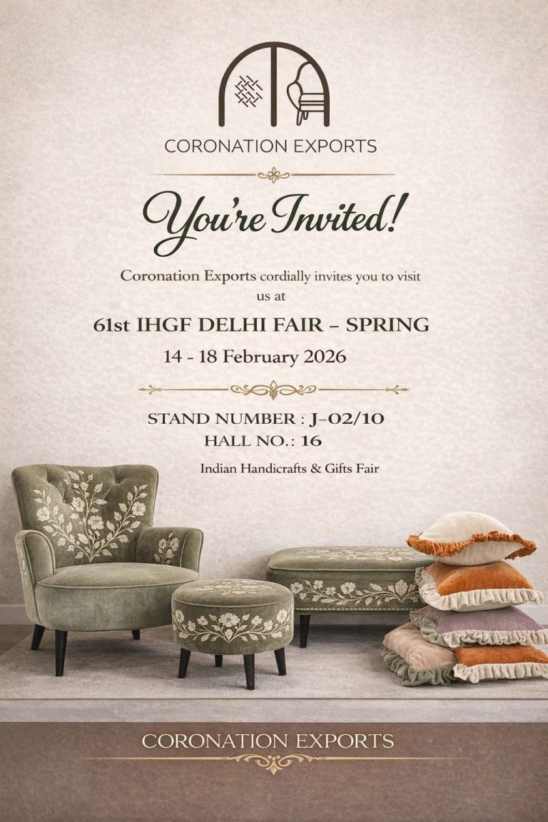 Every year, Coronation Exports unfolds excellence of innovation and artistry at the IHGF Delhi Fair, We invite you to witness the latest in home textile and furnishing. Step into our world, where design meets comfort, and creativity knows no bounds. Join us at this grand showcase, where each visit promises new discoveries, trends, and the unveiling of our exquisite creations. From handwoven textiles to avant-garde furnishings.